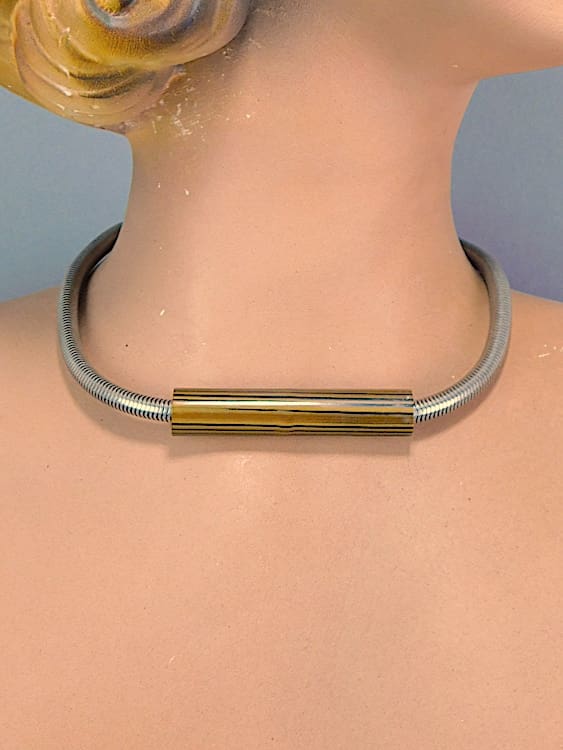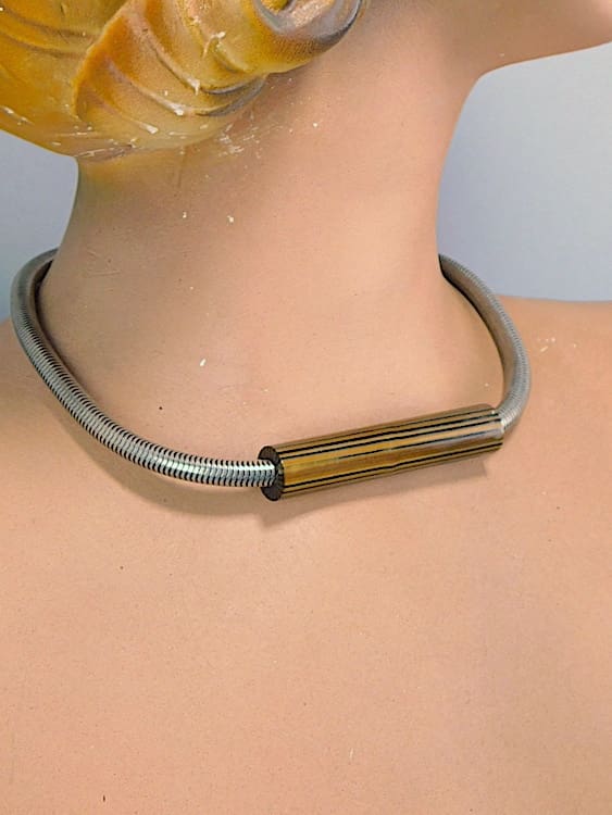 Tiger stripe galalith, chunky snake chain choker necklace. Made in the early 1930’s by the Jakob Bengel company and fitted with a screw clasp. Similar necklaces can be found in the Bengel books.