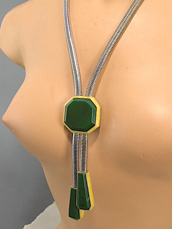 Black and yellow Galalith art deco snake chain necklace. Made in the late 1920s – early 1930s by the Jakob Bengel company in Idar Oberstein Germany.