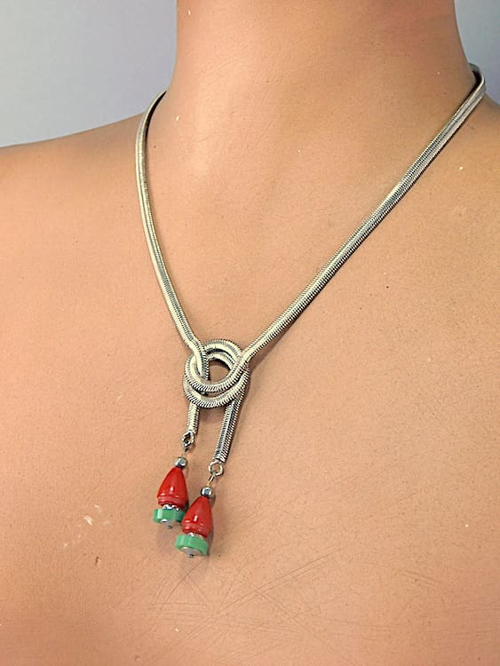 Green and red galalith and chrome smaller snake chain necklace, made by Jakob Bengel in the early 1930’s.