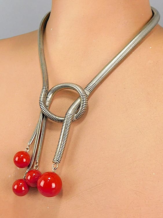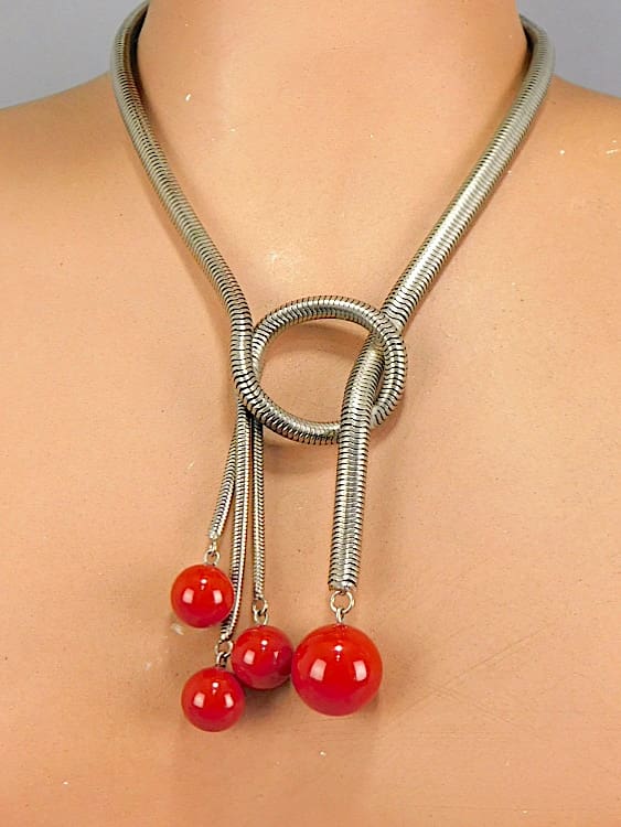 This stunning necklace was made in the early 1930’s by the Jakob Bengel company. It is one of his famous snake chains, this one is rare as it is a choker and has a large single snake to one end and splits into 3 at the other end both with red galalith balls.