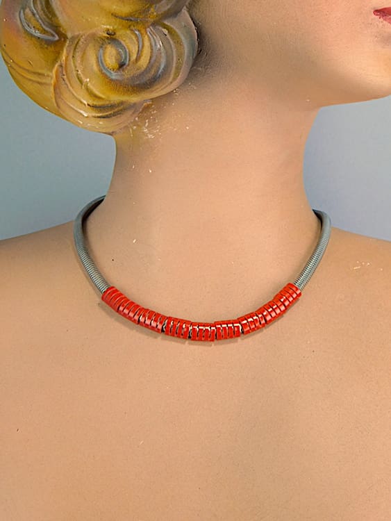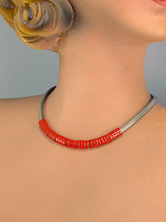 Red galalith and chrome snake necklace by the Jakob Bengel company fitted with a screw clasp.