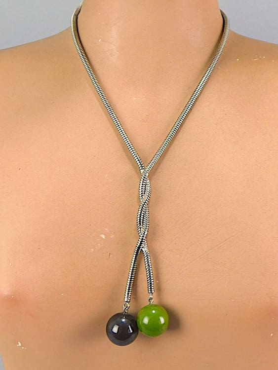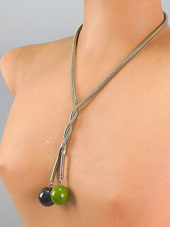 Snake necklace with green and black galalith balls made by the Jakob Bengel.