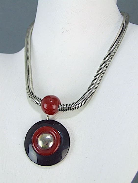 Chunky snake chain art deco necklace with central pendant in black and red/brown galalith. Made in the early 1930s by the Bengel factory, this is a new/old stock item.
