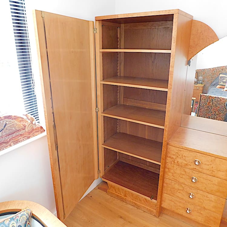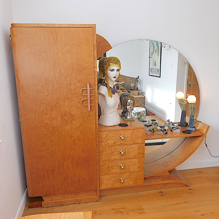 French Art Deco Birdseye maple modernist spaceship wardrobe and dressing table. The 2 pieces are attached to each other. The wardrobe has 5 internal shelves (including the base) and the dressing table section has 4 drawers. The handles on the drobe door in copper and gilt metal and the drawers are chromed metal.