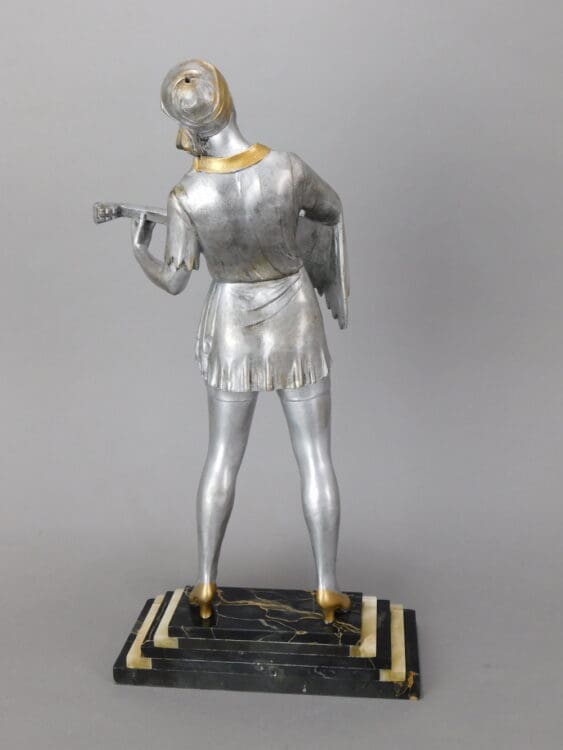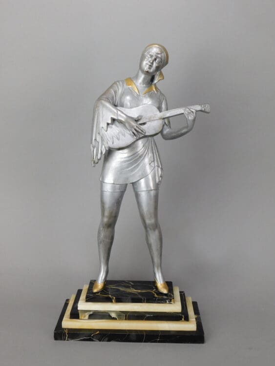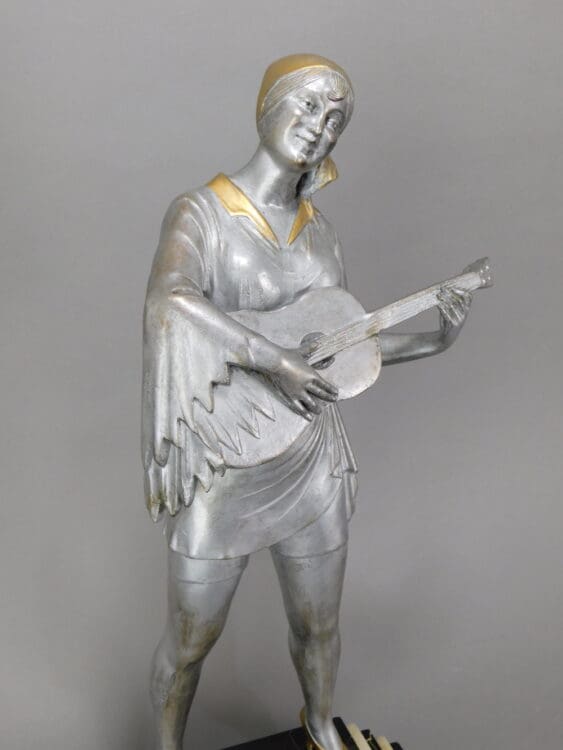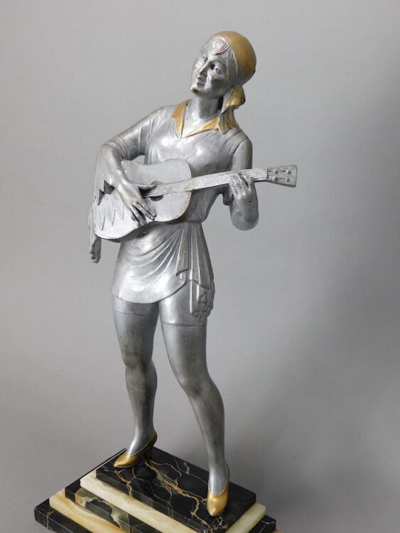 A large art deco guitar player – A French spelter lady dressed in wonderful Spanish – gypsy style clothes standing on a stepped marble base. In the style of Enrique Molins-Balleste although apparently unsigned.