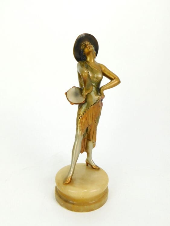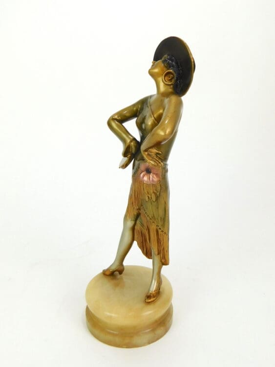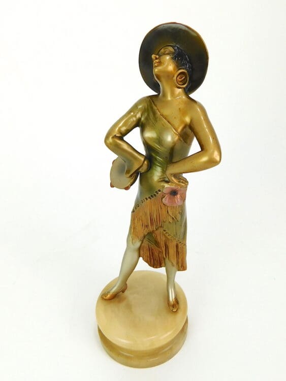 An unsigned gold patinated spelter dancer by Lorenzl and often sold in pairs with a male flamenco dancer.