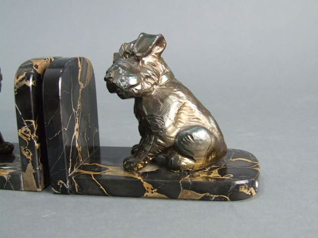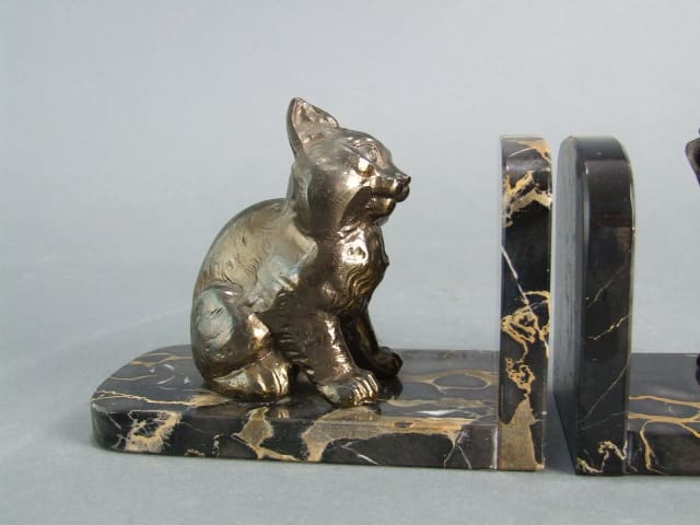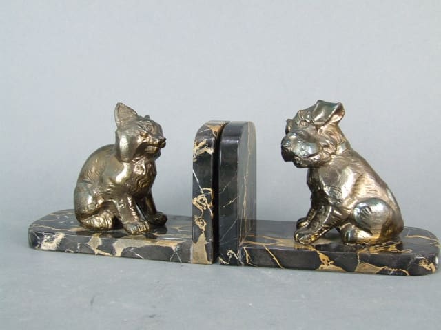 A pair of cute French spelter bookends of a dog and cat with their original bronzed patina, mounted on Portorro marble bases.