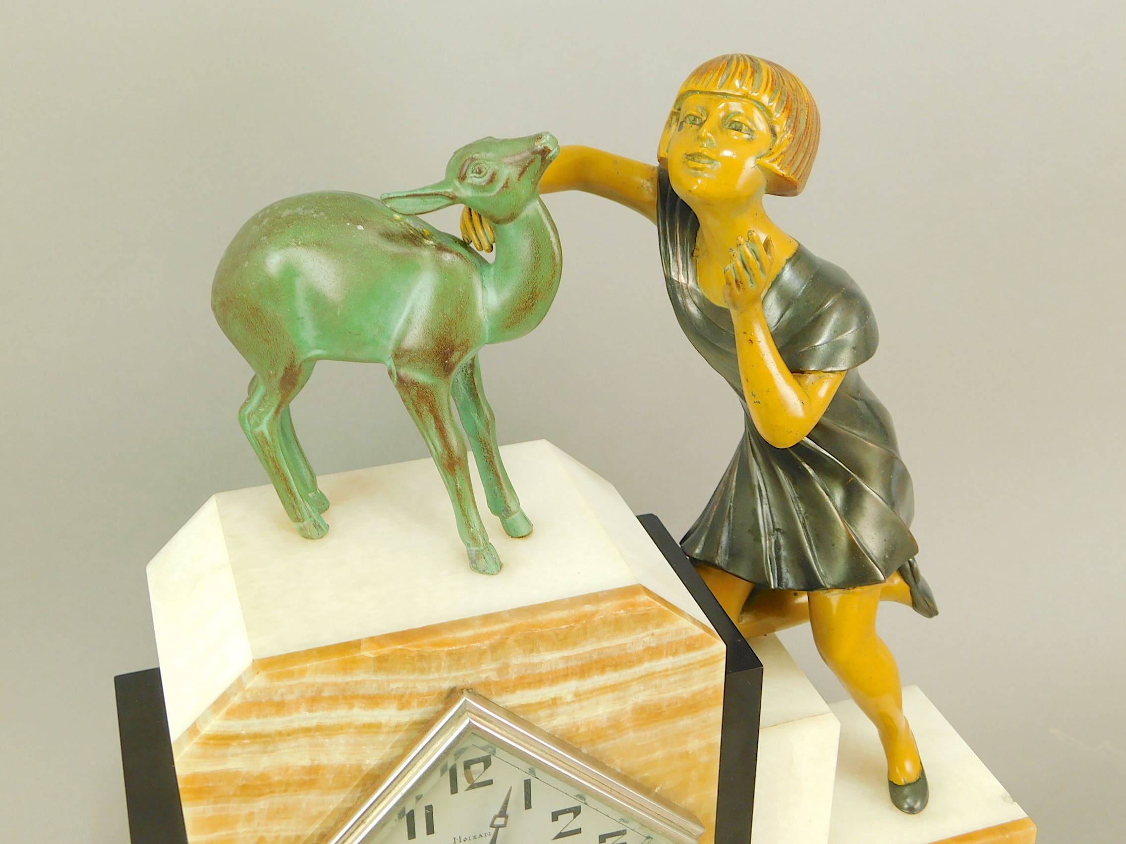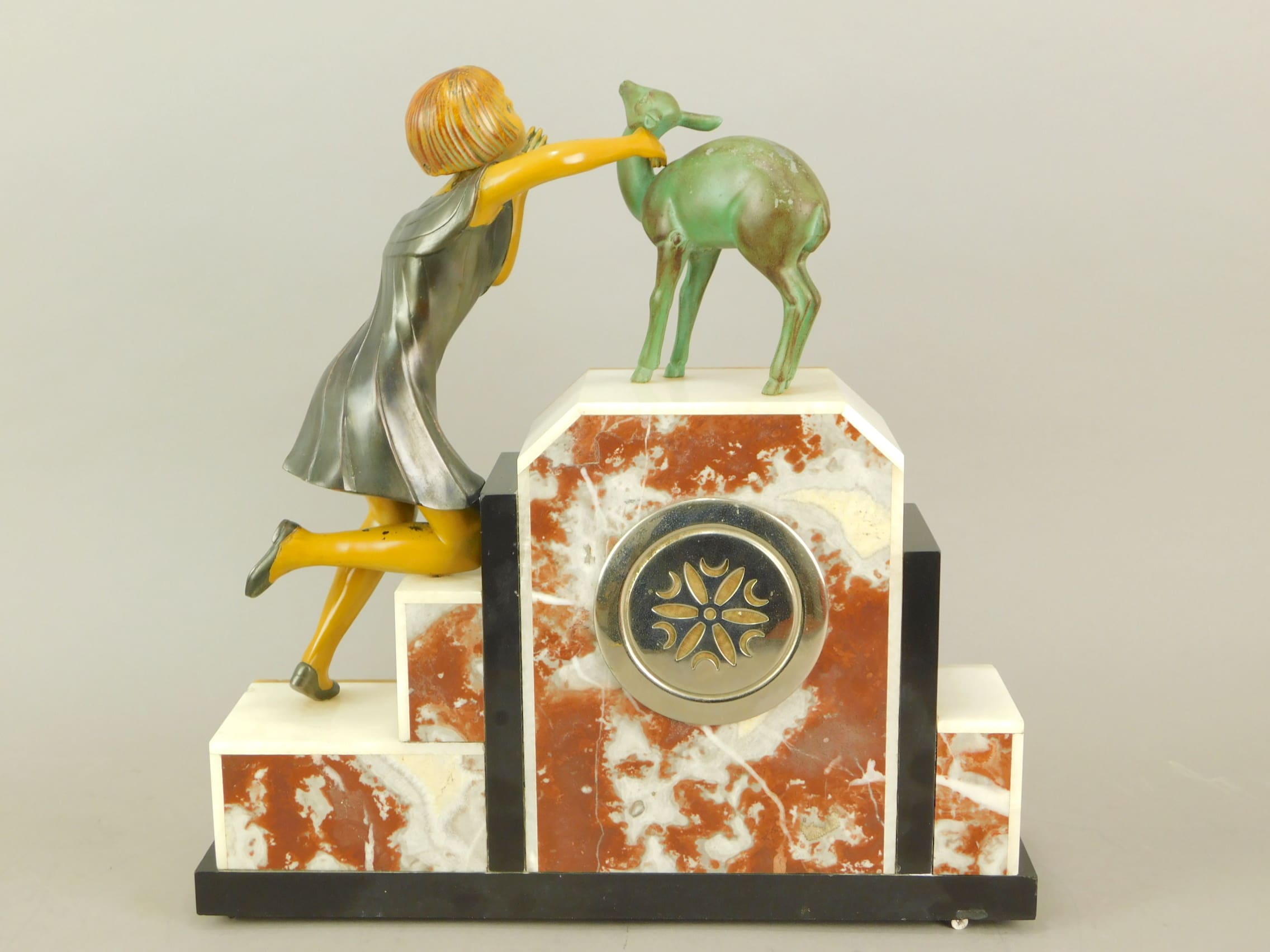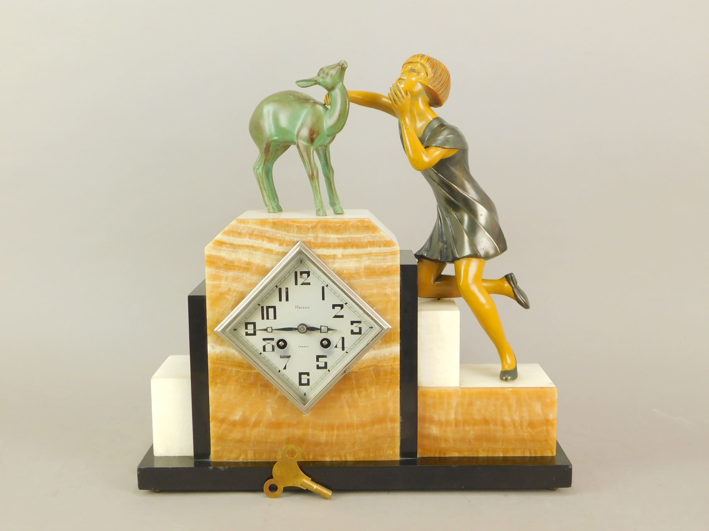 French spelter clock set in original condition complimented by 2 matching side pieces.