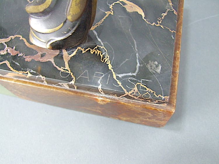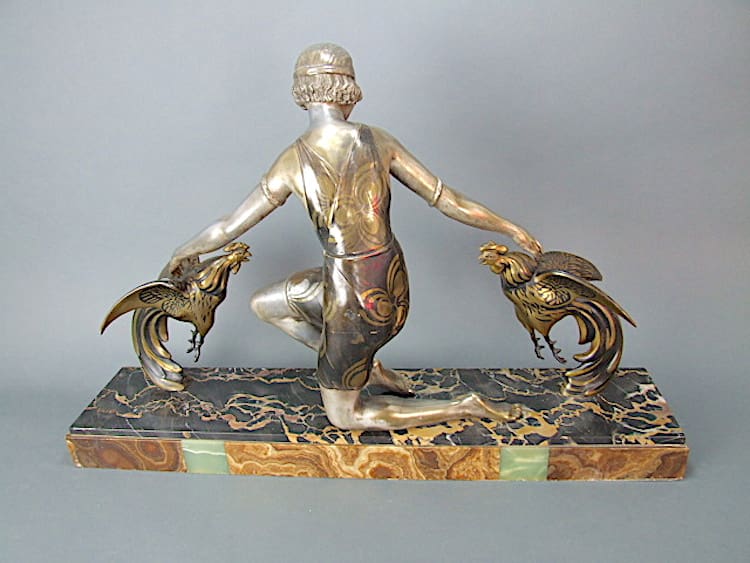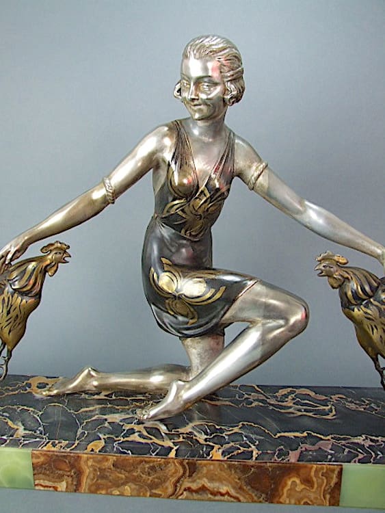 Large French spelter figural group, signed to the base G Arrisse. Silvered patina with dinanderie patterning to her dress and the cockerels. Mounted on a portorro marble base. The front of the base has onyx detailing.