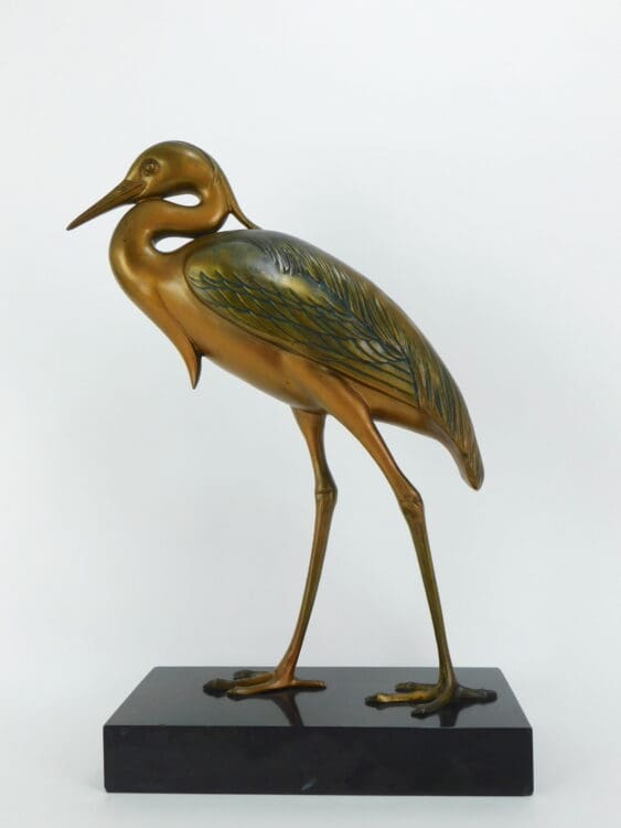 Large French spelter heron, unsigned but probably by Rochard. He has a gold and green patina and is mounted on a Belgian black marble base.