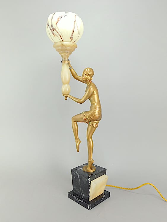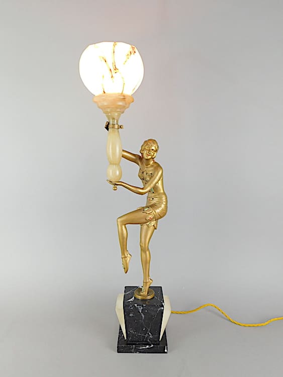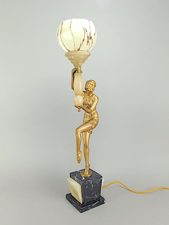 A gold painted lady lamp, although looking very much like a recent re-patination, with brown swirl glass shade, possibly not original, and mounted on a black marble base with onyx side sections. The shade is held in an alabaster or onyx torchere and has recently been rewired.