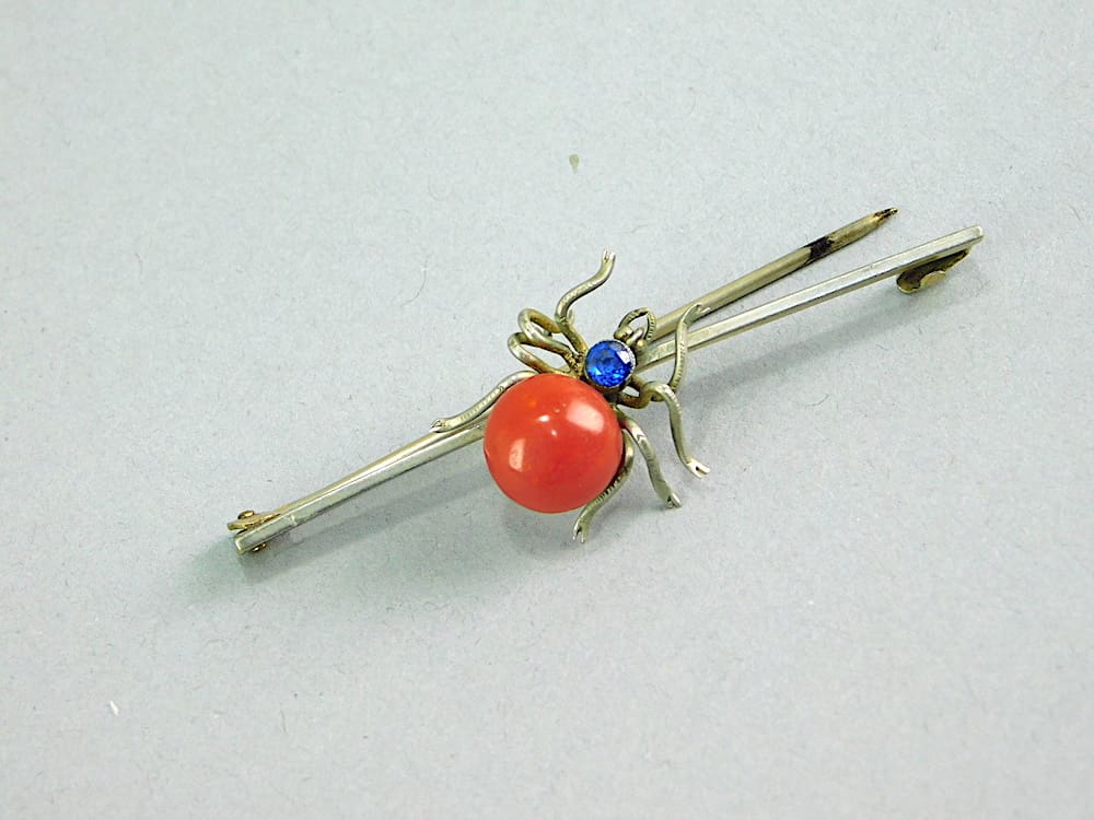 This lovely celluloid body and blue glass stone spider is either a brooch or a tie pin. But as it is small I think more likely to be a tie pin. It could possibly be silver but I cannot find any marks.