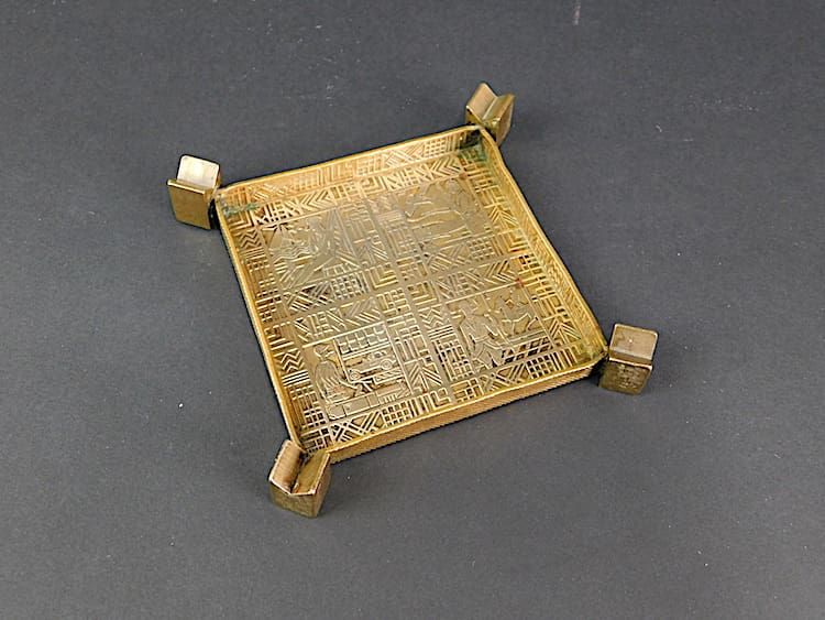 Austrian 1920’s sports themed bronze ashtray depicting, A sailor with a yacht, a pilot with a plane, a lady with a car, and jockey with a horse. All figures are smoking.