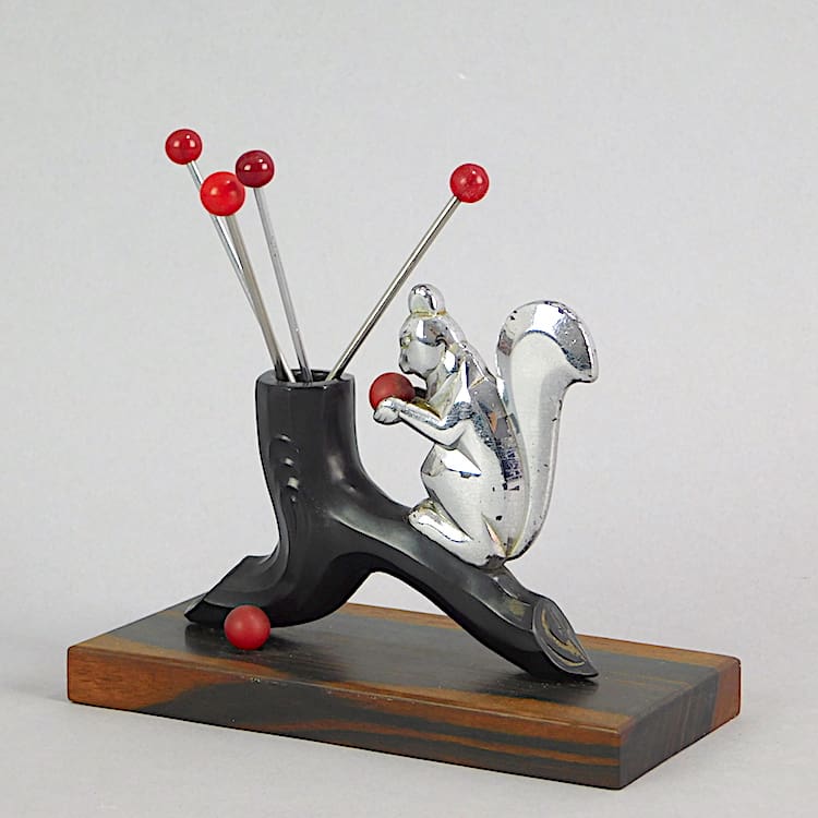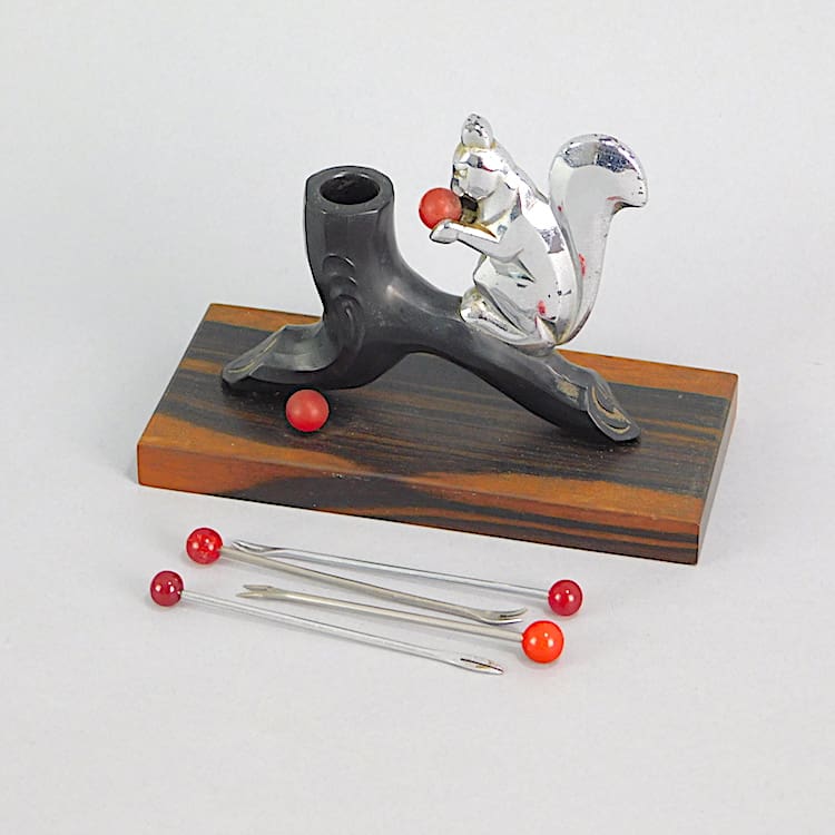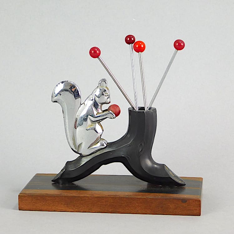 French macassar base with chromed metal squirrel on a phenolic tree trunk. Comes with 4 cocktail sticks one with a slightly different coloured end.