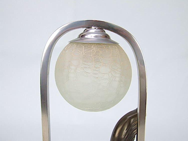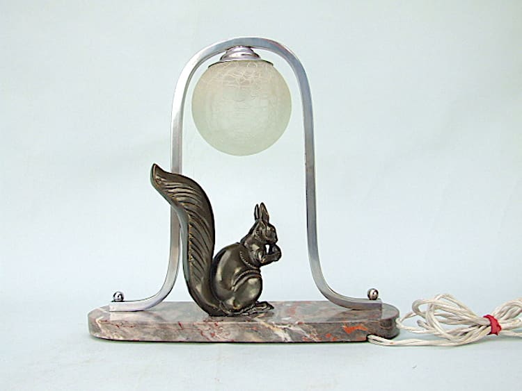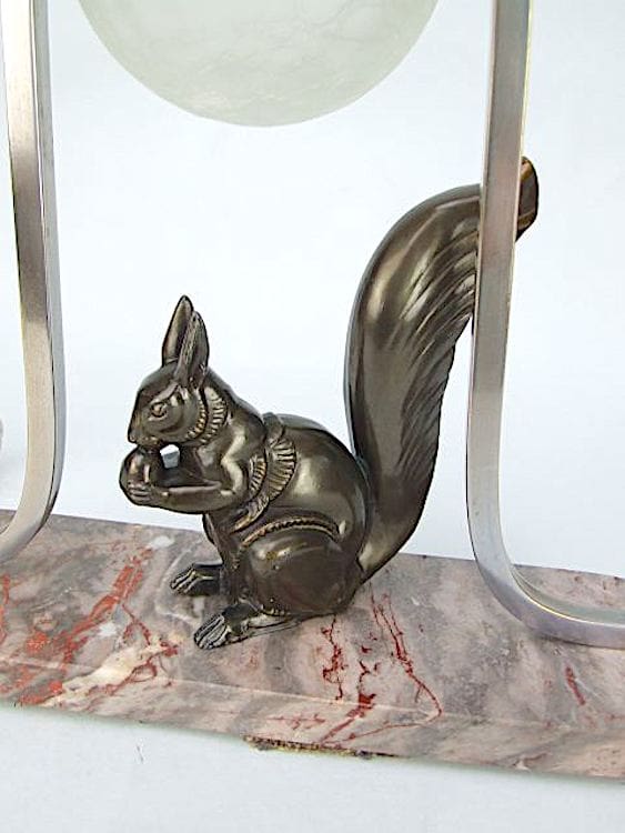 French spelter art deco squirrel desk lamp, unsigned but probably by Tedd. Mounted on a amble base, sitting under a crackle glass globe. Appears to have been re wired with silk flex and has an original bakelite torpedo on/off switch.