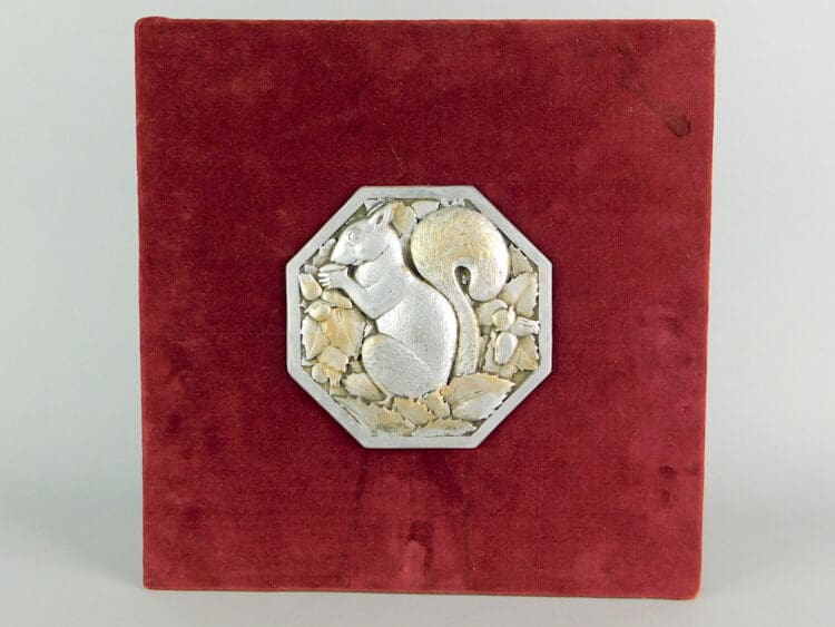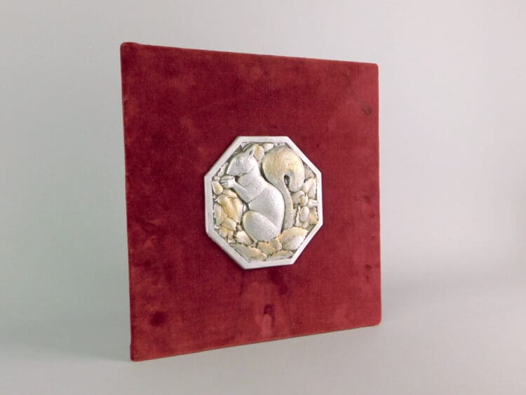 A French gilt and silvered metal plaque of a squirrel with leaf and nut design. Signed Thenet but indistinctly.