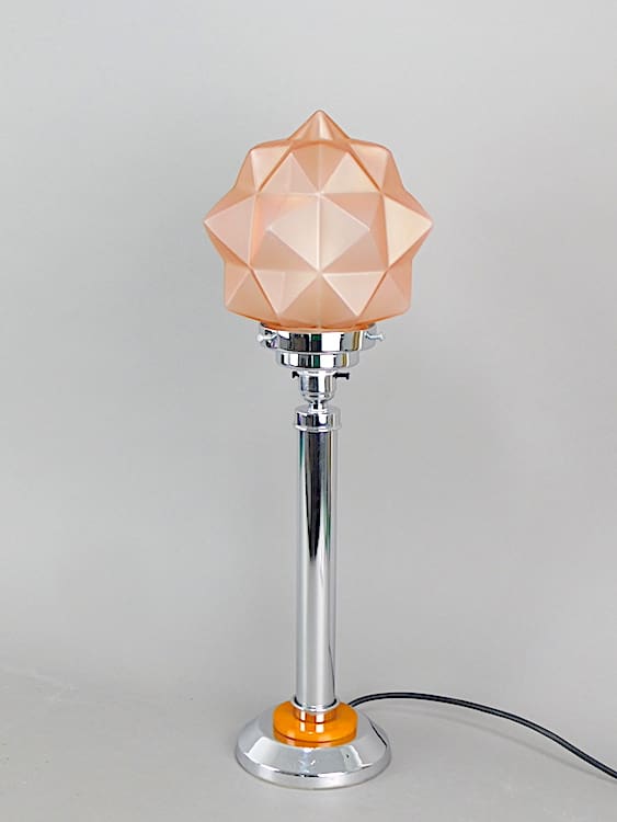 Phenolic and chrome table lamp with peach glass star shade. It has an on/off switch to the stem. Rewired.