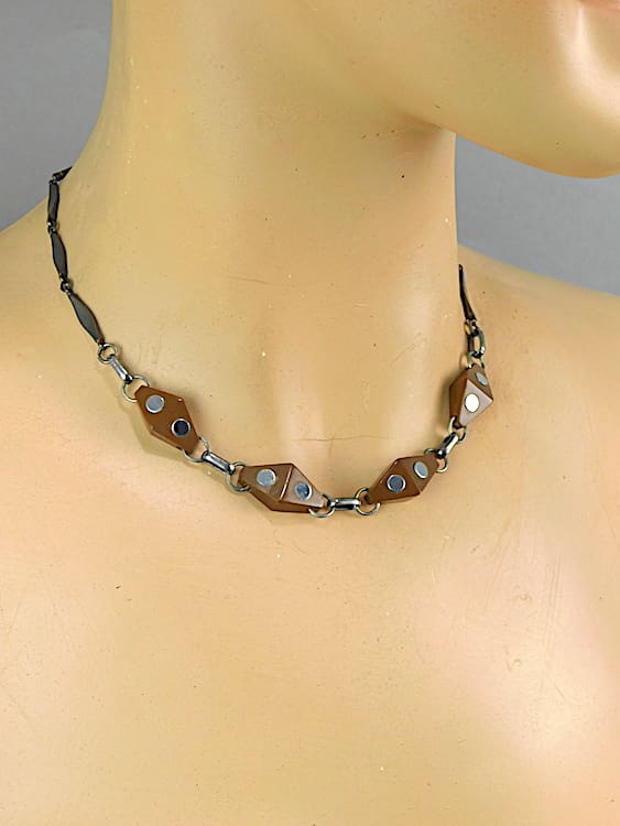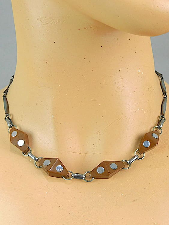 German modernist brown galalith and chrome necklace made in 1932. Fitted with a screw clasp. Similar style diamonte beads with chrome studs can be found in the Bengel book vol 1, on page 199.