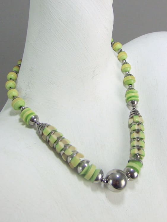 Green and cream galalith necklace, made by Jakob Bengel in the 1930’s and fitted with a screw clasp.