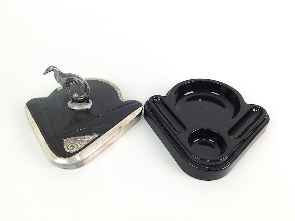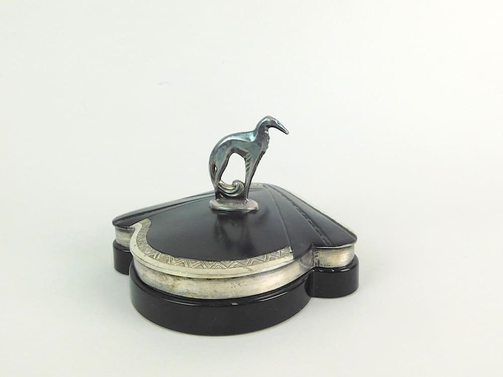 Silvered metal fan lid with stylised borzois handle and black vitrolite base. The base has 4 sections and the lid has art deco fan shapes inside. Bears a makers stamp and possibly a hall mark, but indistinct. Also marked copyright USA. Possibly by Chase.
