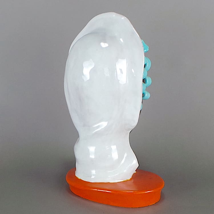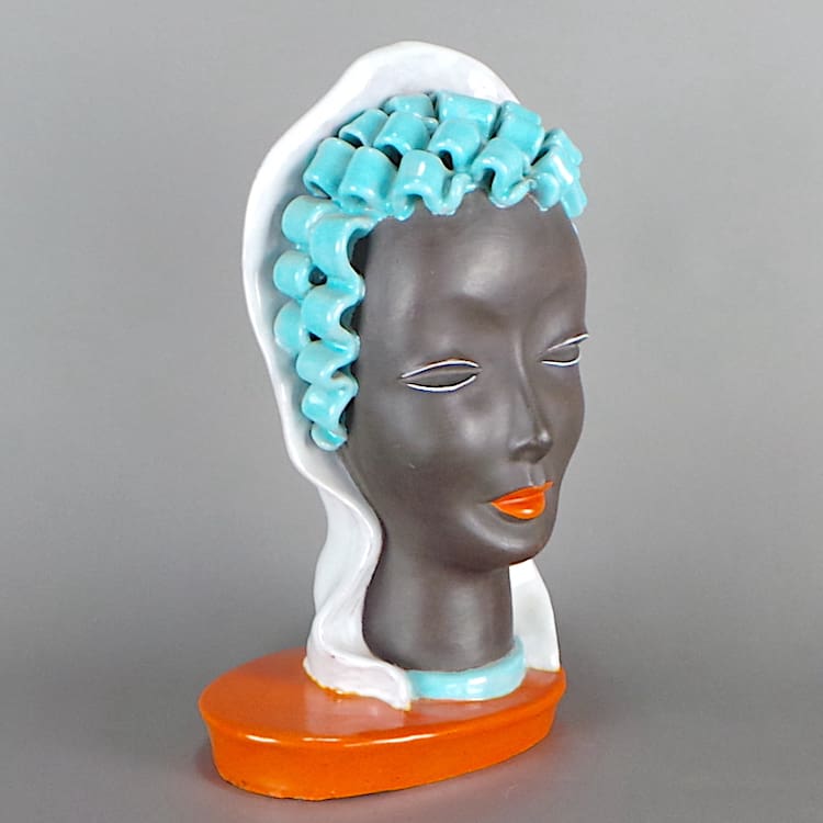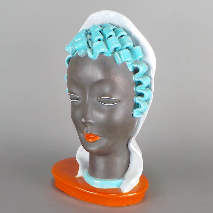 Large rare free standing Art Deco bust by Goldscheider – a lady with blue sausage curls and a cream headscarf. Orange glaze finishes the base.
