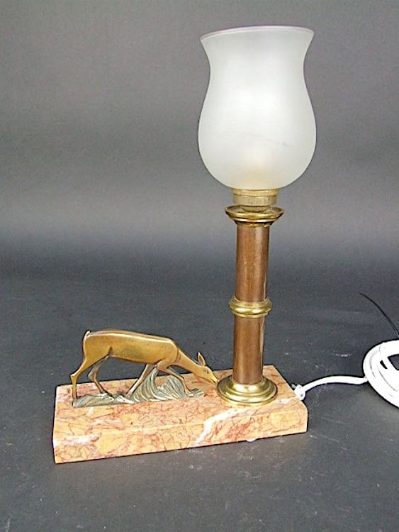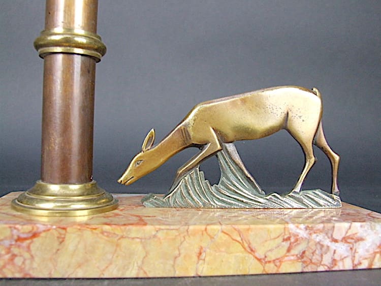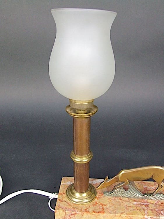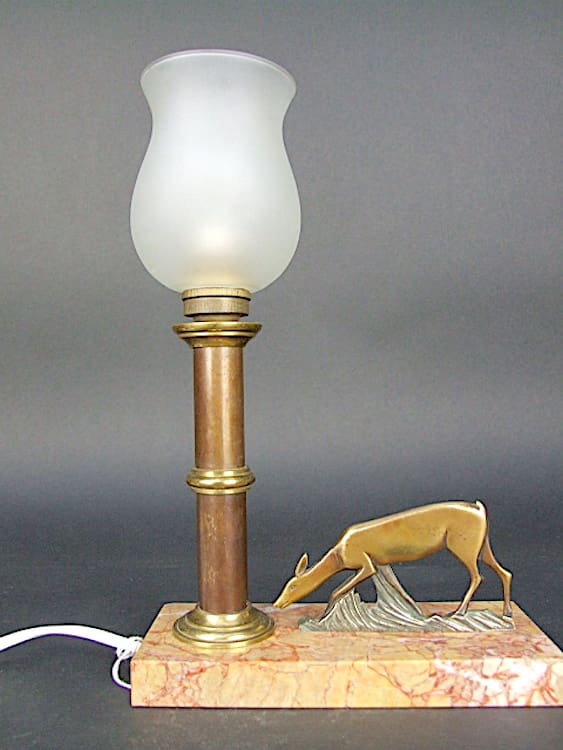 French table lamp in the form of a bronze 2 dimensional deer on grass. The base is made of pink marble.