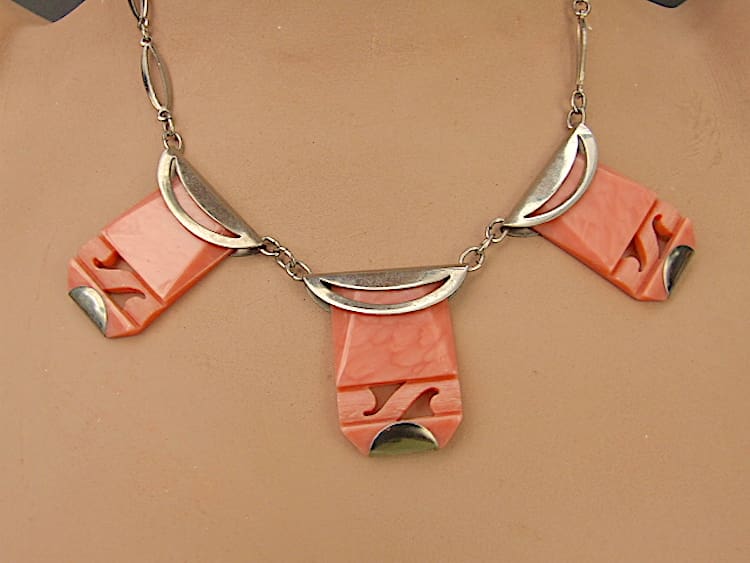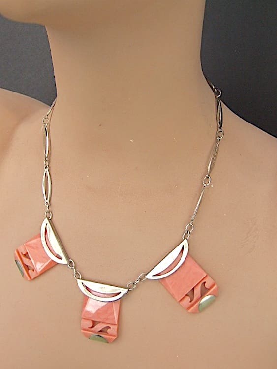 Pink galalith bauhaus necklace. Mae by Bengel in the early 1930’s.