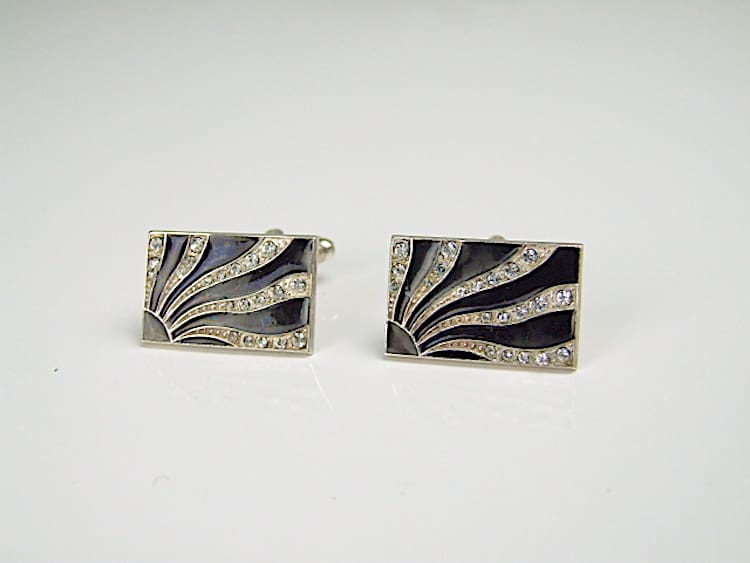 Large modernist sunray design cufflinks with black enamel and diamonte patterning each with twist catch to the back.