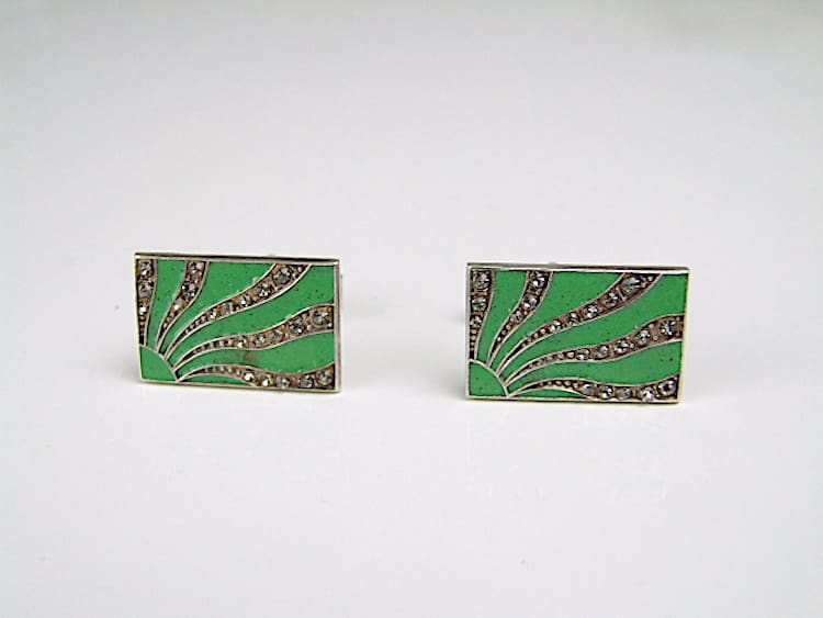 Large modernist sunray design cufflinks with green enamel and diamonte patterning each with twist catch to the back.