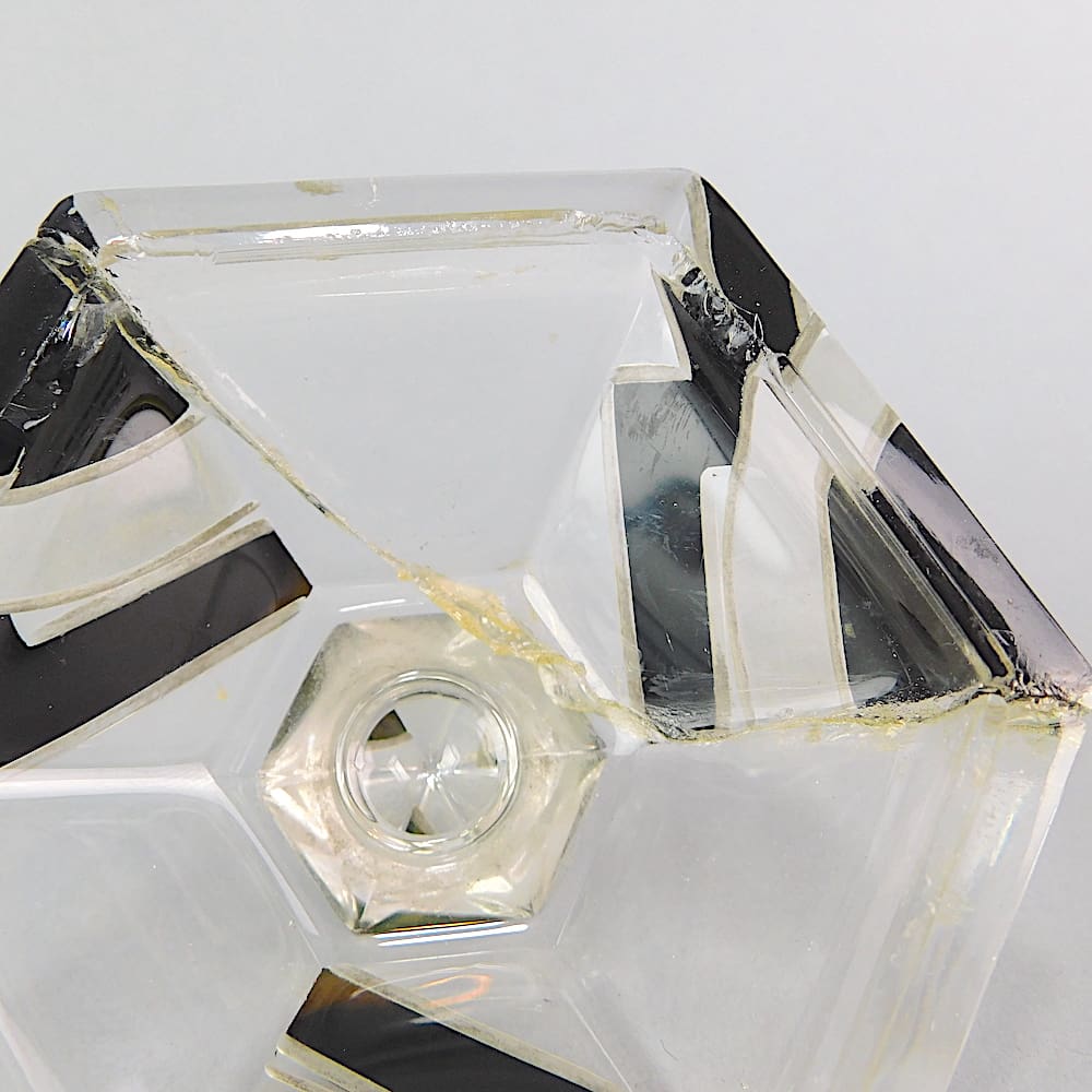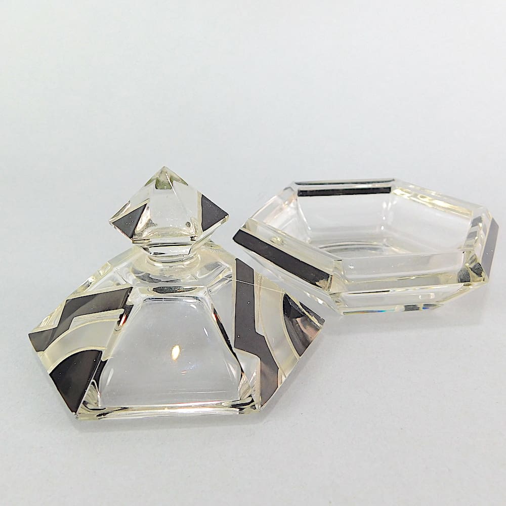 Czech leaded glass and black sunray pattern. There are actually 3 pieces but I am only charging the buyer for 2, the 3rd powder bowl is free as the lid is damaged and regaled.