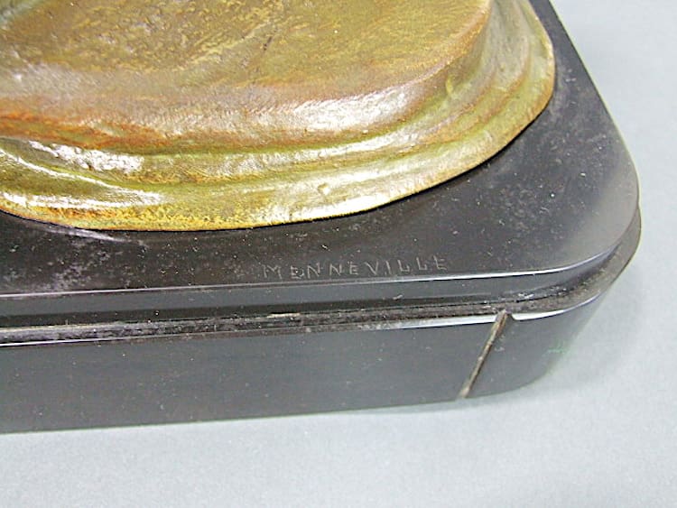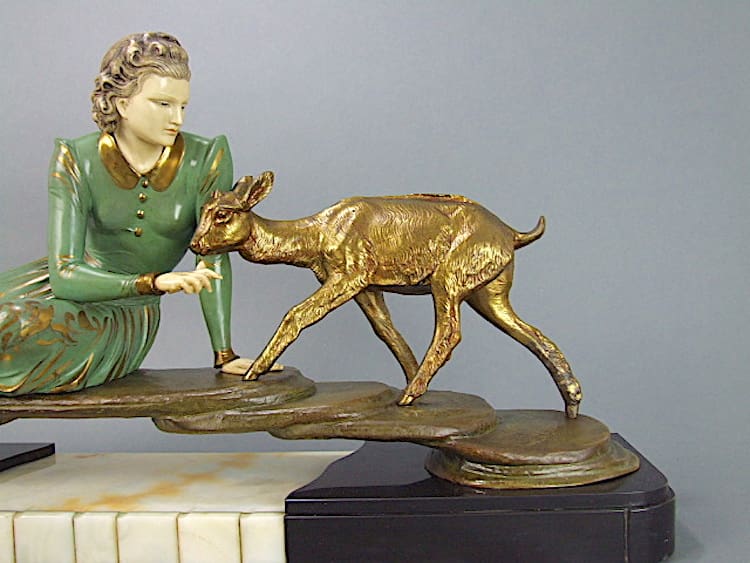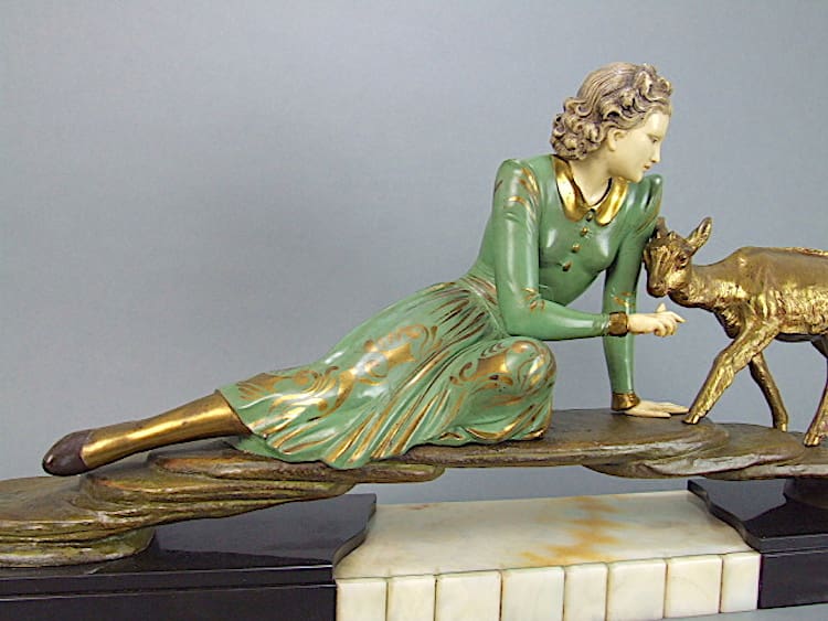 French spelter and ivorine (phenolic) lady with dinanderie patterning to her green dress.