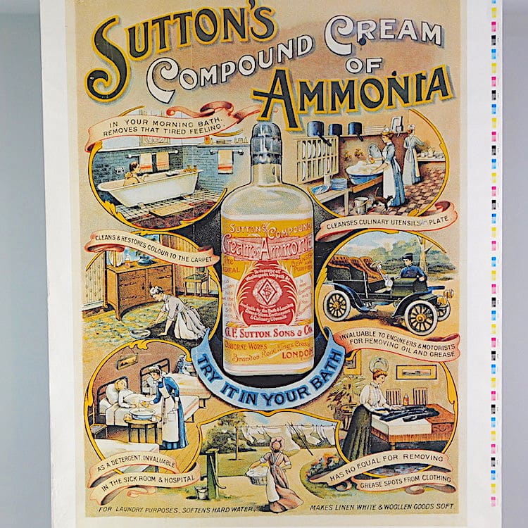 A poster advertising Suttons compound cream of Ammonia. Yes, Ammonia! It would appear that at the time it was considered good for cleaning, dropping in the bath, cars engines and even sick people.