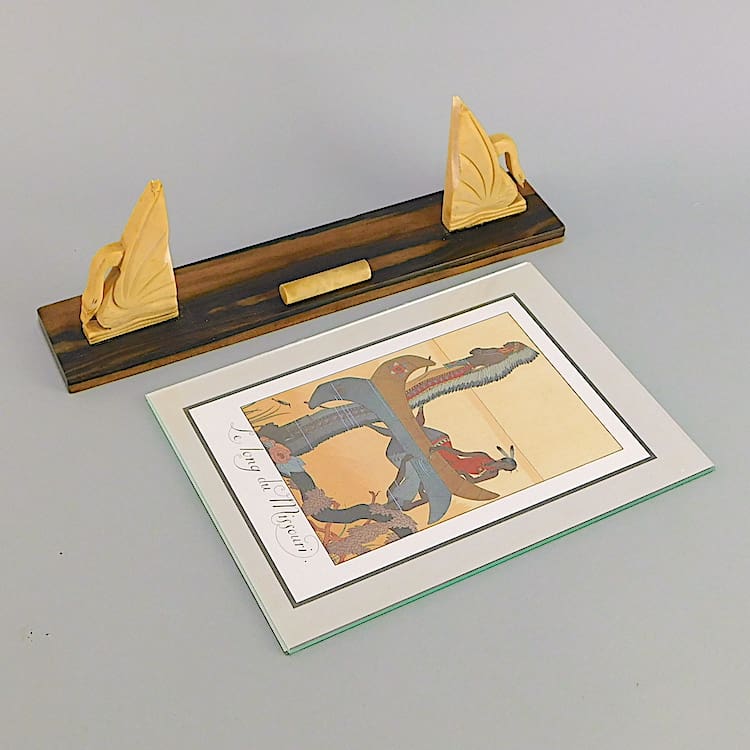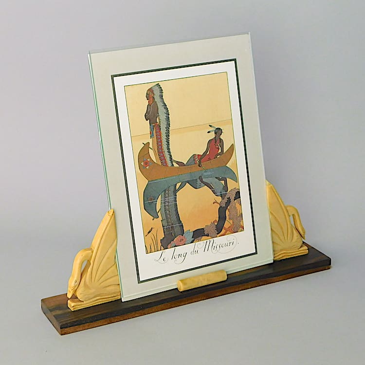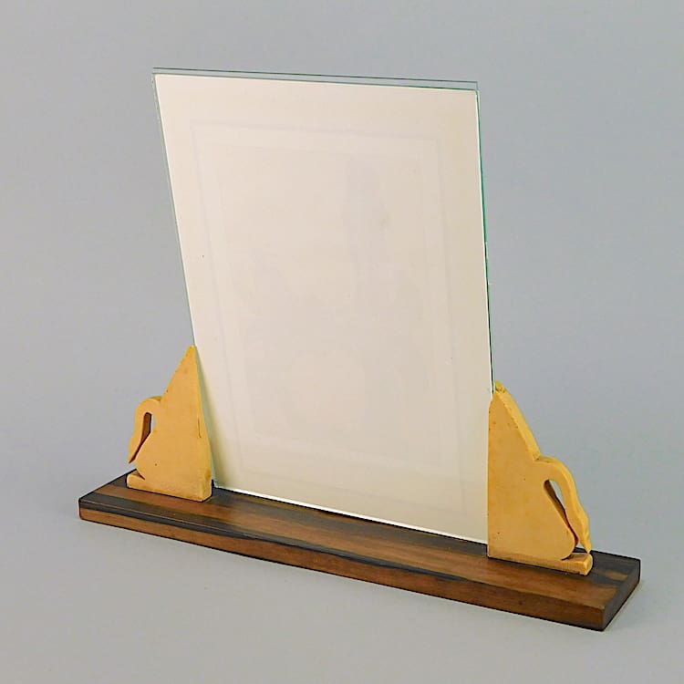 French art deco photo frame with macassar base and phenolic swan supports.