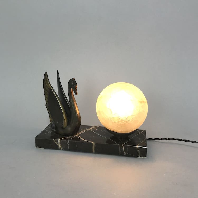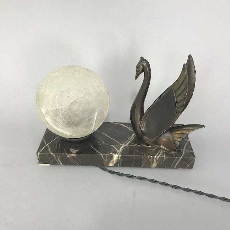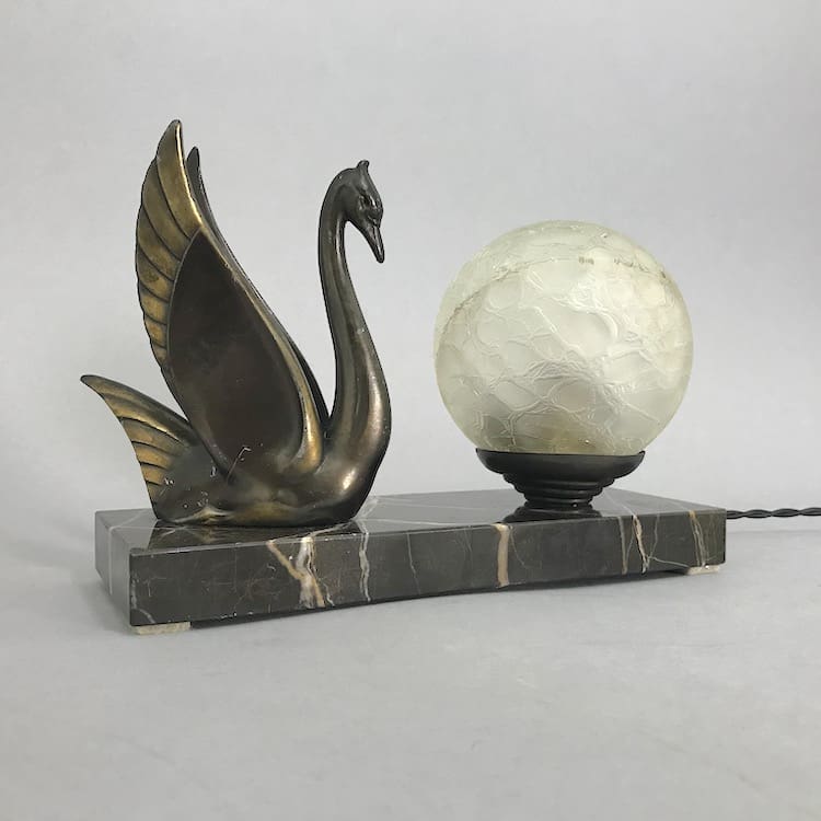French art deco spelter swan table lamp. Unsigned but probably by Tedd.