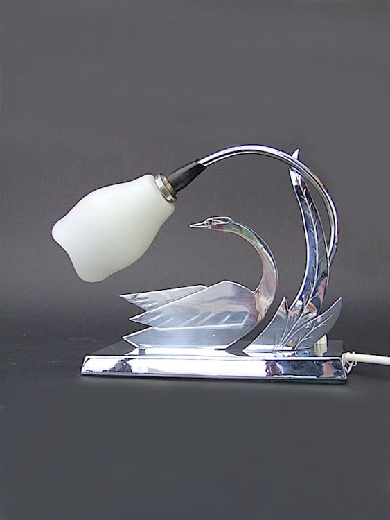 French chrome two dimensional stylised swan table lamp with white glass tulip shade.