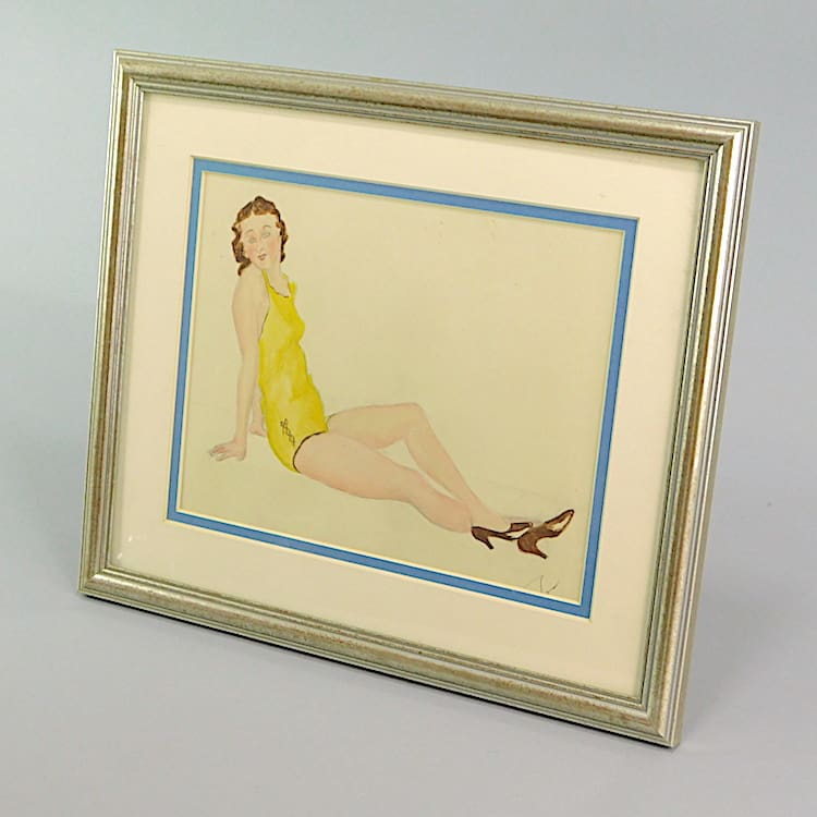 This cute original water colour is of a bather and is mounted in a contemporary silver frame and is signed althougn indistinctly.