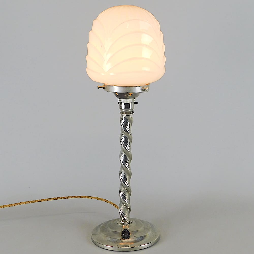 English art deco chrome table lamp with a swirl pattern to the stem.