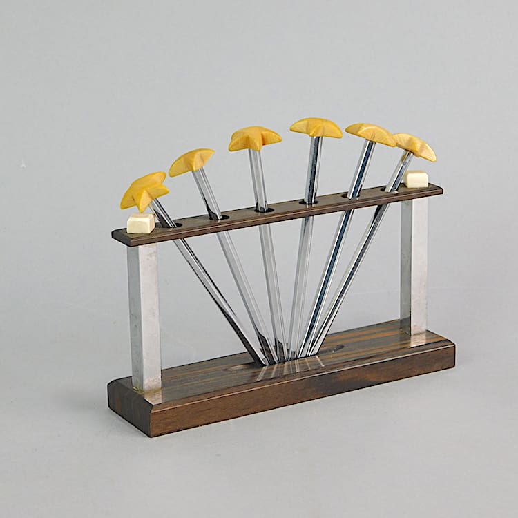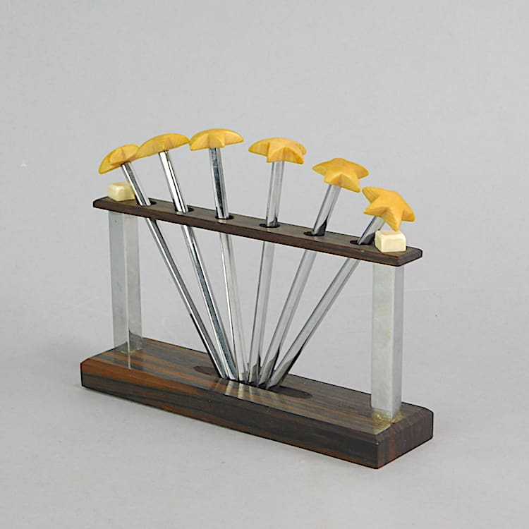 Chrome and phenolic palm tree swizzle sticks set on a macassar, chrome and phenolic stand. Top quality set.