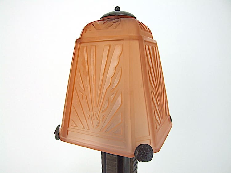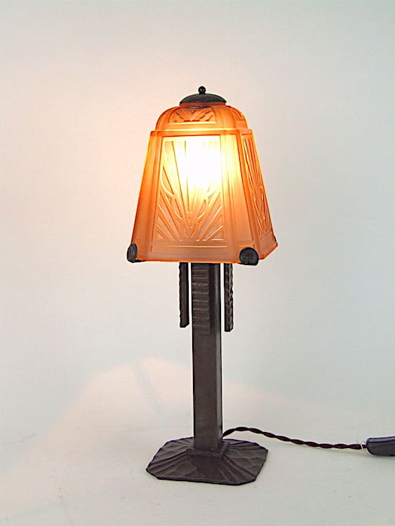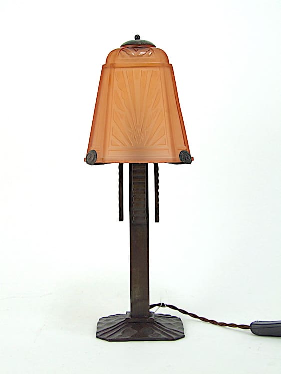 French art deco fer forge table lamp with peach glass Sunday Muller Frere shade, Unsigned but definitely Muller Frere.