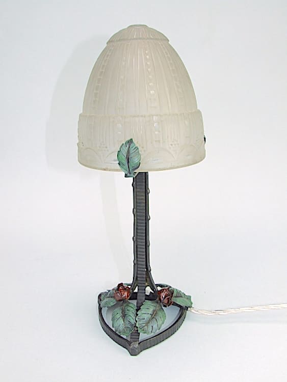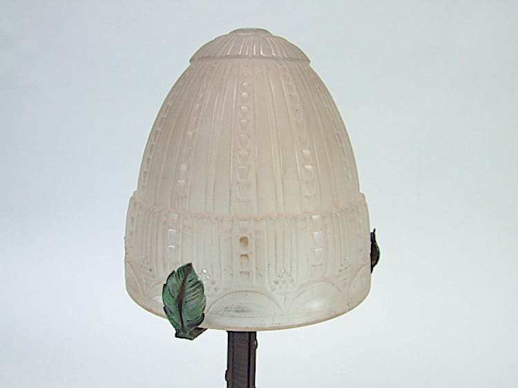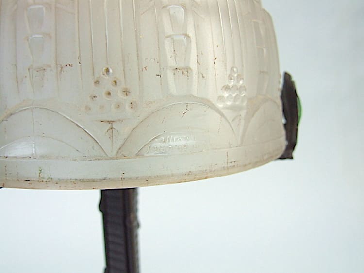 Holding a frosted glass shade and signed Muller Freres to the glass.