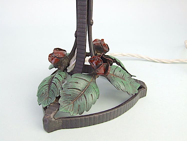French wrought iron table lamp with ivy leaf base and with remnants of green and red enamelling.