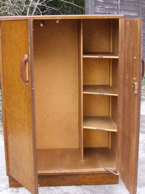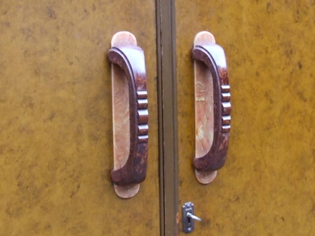 Amboyne or walnut tallboy with double doors and chunky bakelite handles. Inside there is hanging space and four shelves.