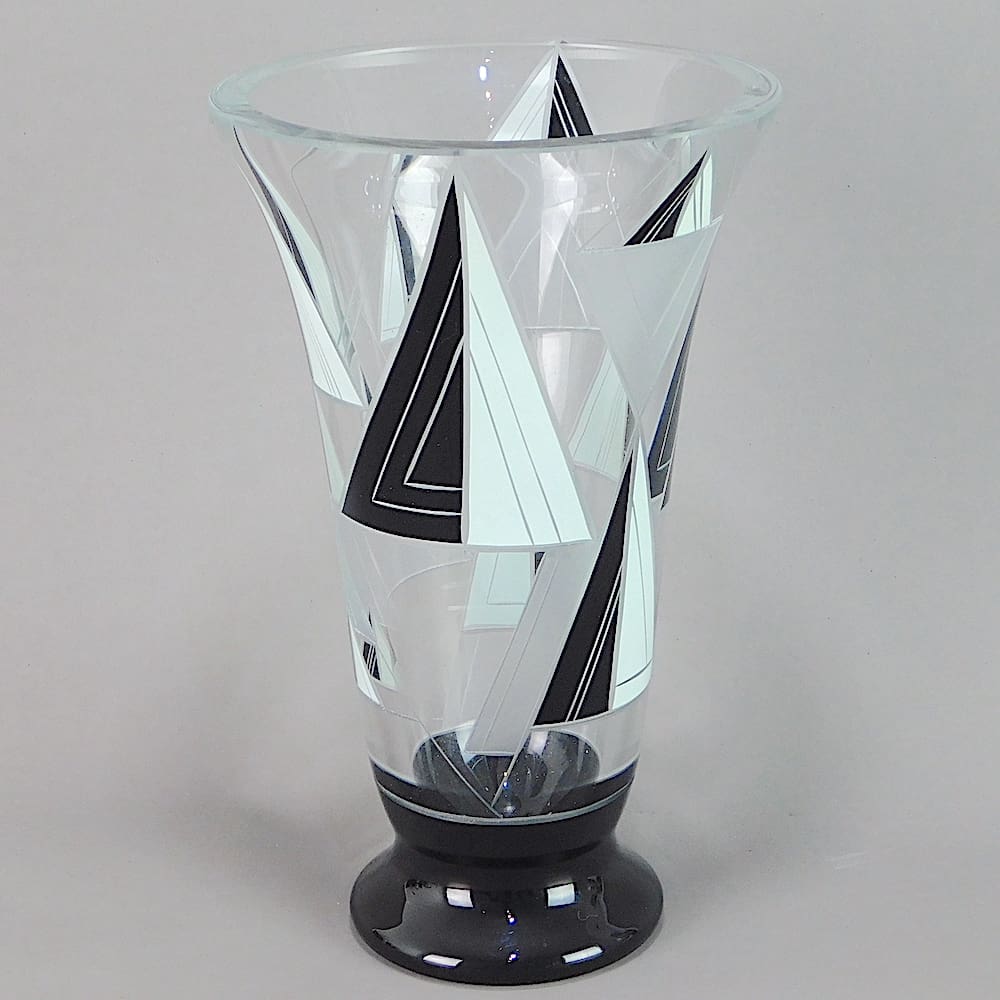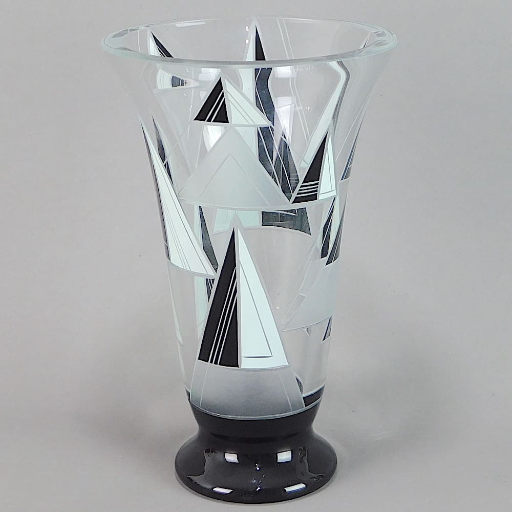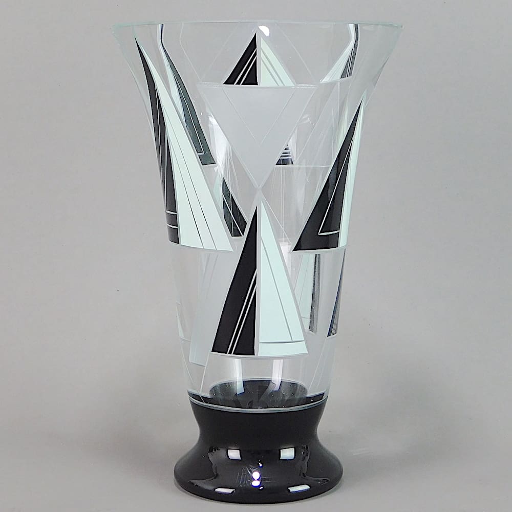 Czech heavy leaded glass vase with frosted, and black enamelled yacht sails detail.