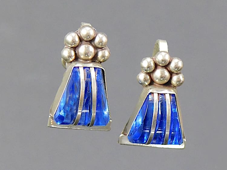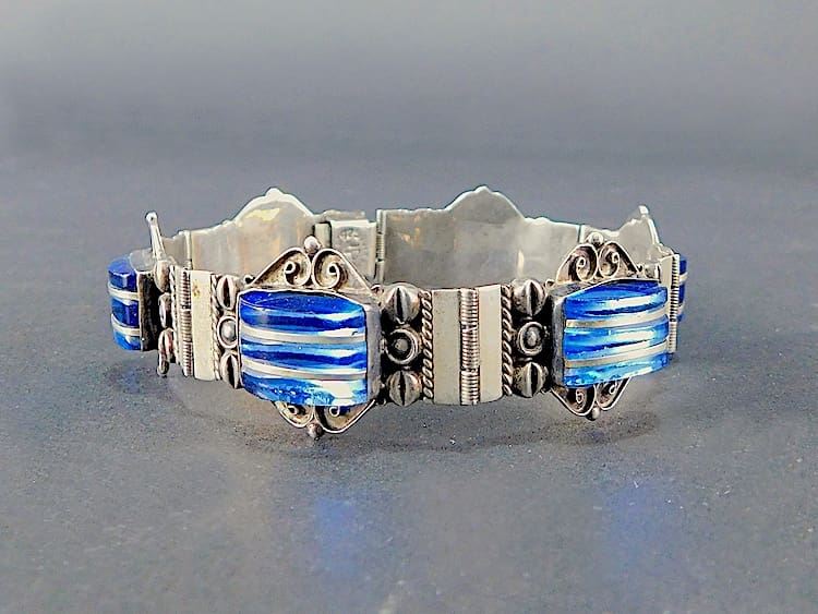 Electric blue glass and silver bracelet and matching earrings set, made by Taxco Mexican silver in the early 1930s. It bears the Taxco markings to the clasp. The earrings are screw ons.