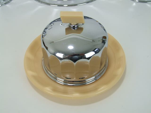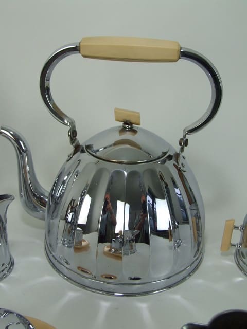 This art deco chromed metal and phenolic handled set was produced in Belgian by the Demeyere company. Demeyere made the modernist smokers stands, smokers tables and plant umbrella stands and coat racks. Their items are now highly sought after and considered to be iconic in design. I have never seen another set like this one. It consists of a large kettle, coffee/tea pot, milk jug, hot water jug, butter dish and sugar bowl.