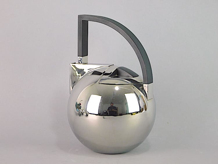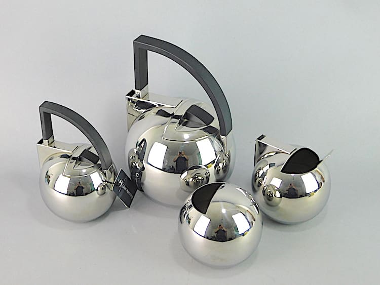 Modernist art deco style stainless set with a large and a small teapot with black phenolic handles.