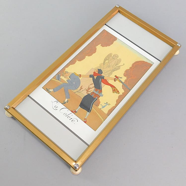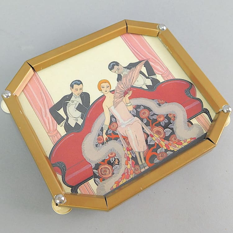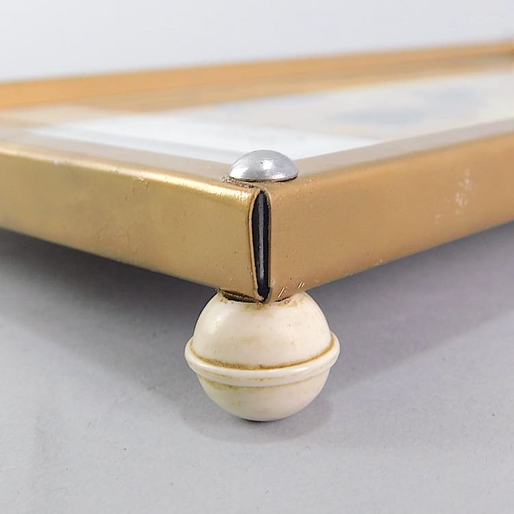 English metal teapot stands with phenolic ball feet. With deco prints under glass.