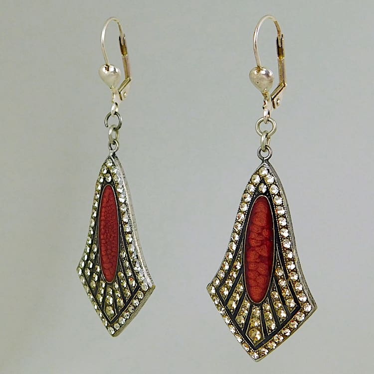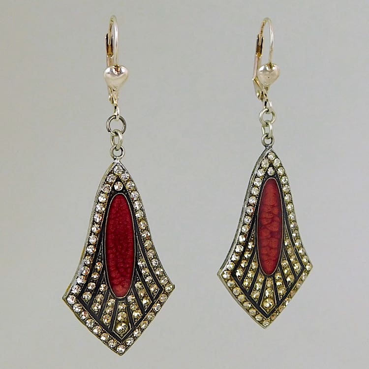 French Pierre Bex teardrop shaped enamel and diamonte earrings. Fitted with silver trigger clasp for pierced ears.