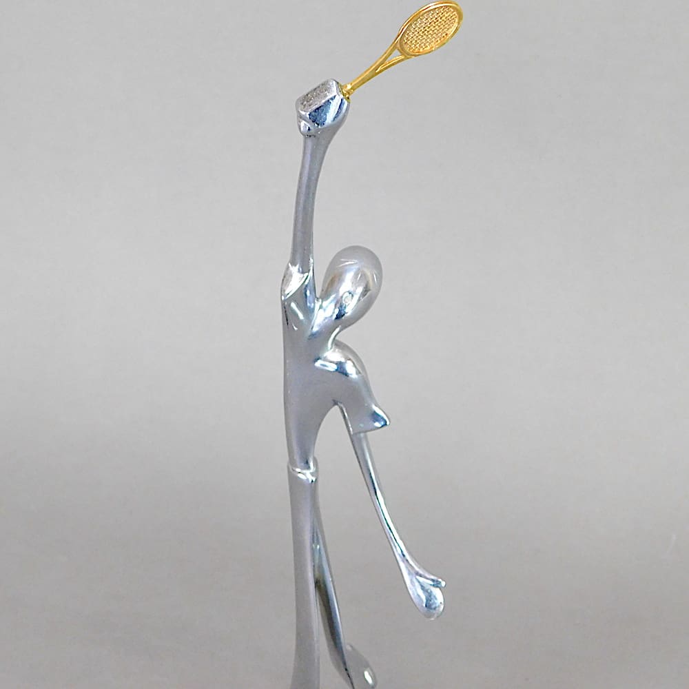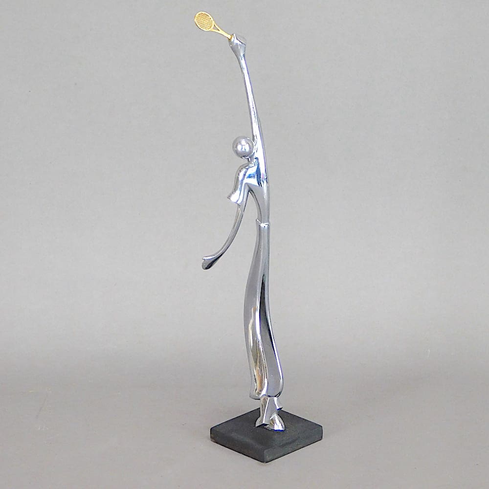An unsigned Hagenauer tennis player in chromed stylised metal and mounted on a wooden base.