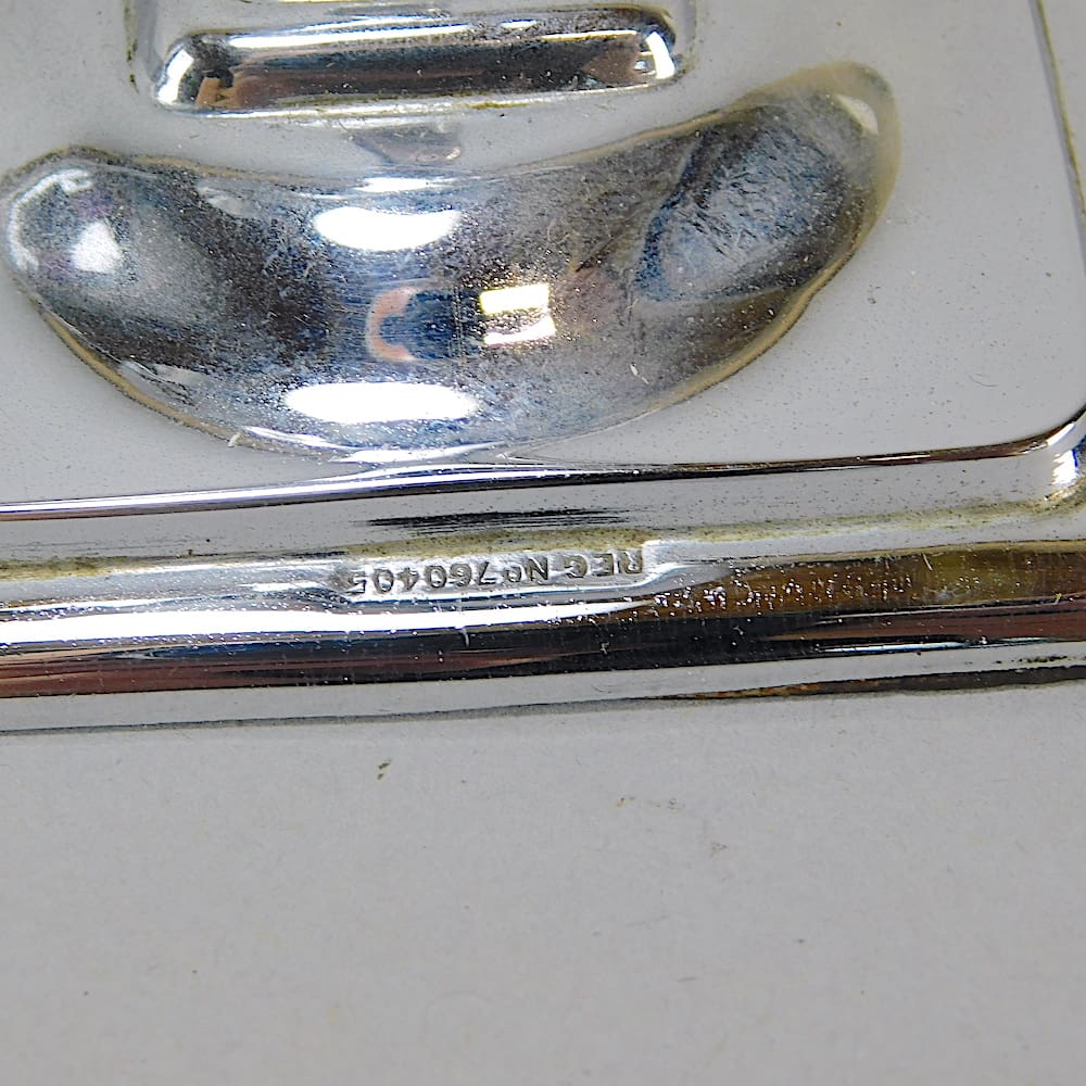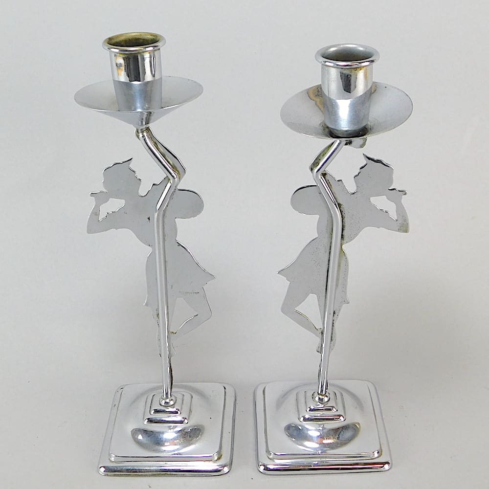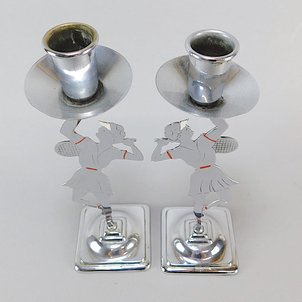 A pair of two dimensional chrome candle sticks depicting ladies playing tennis with white and red enamel detail.